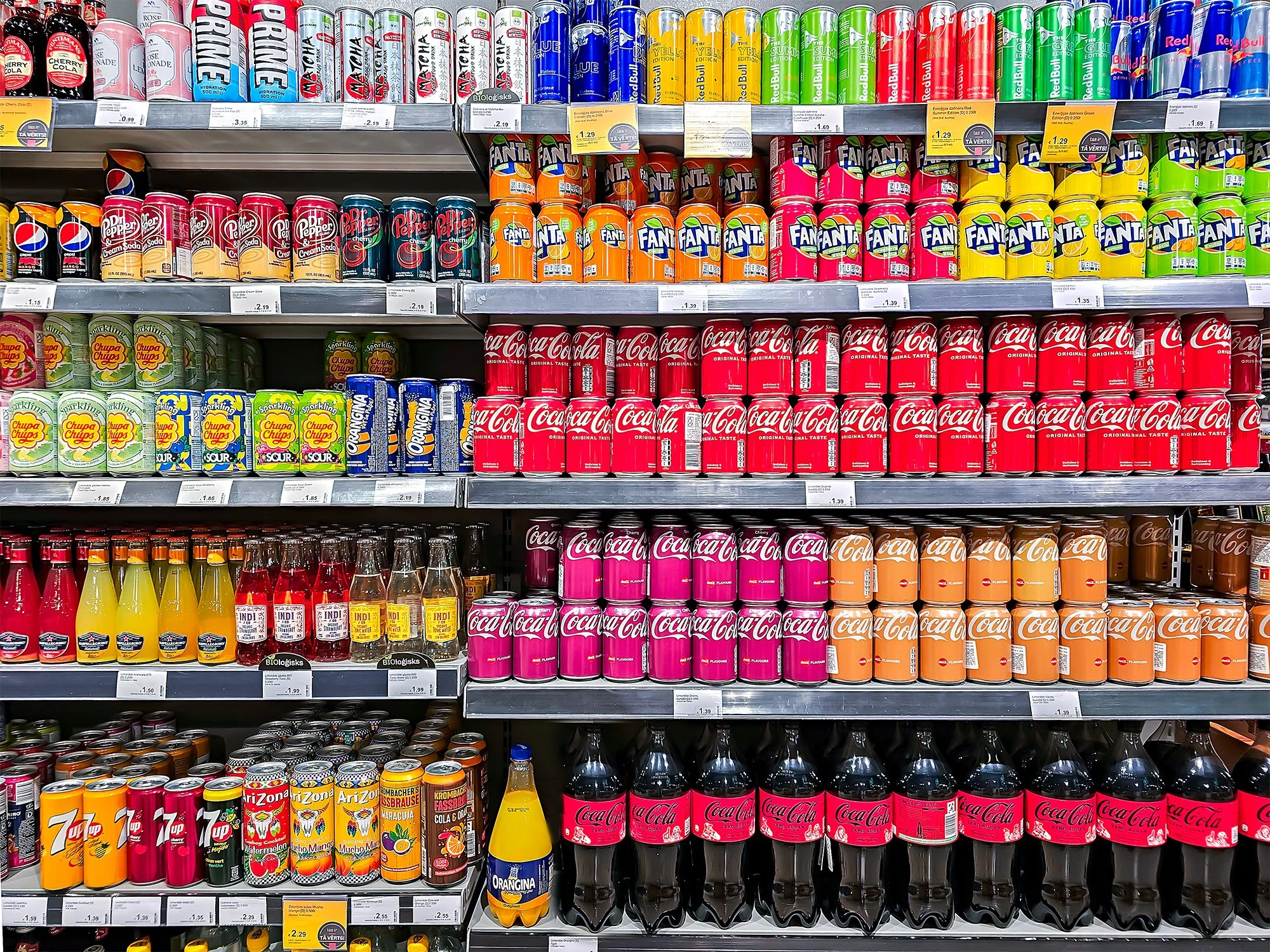 Sugar-sweetened beverages can be purchased everywhere in the US: grocery stores, drive-thru’s, sit-down restaurants, gas stations, movie theatres, amusement parks, sports stadiums and are available at parties, weddings, and other gatherings. In the early 2000s, nearly 75% of high schools, 65% of middle schools, and 30% of elementary schools had exclusive contracts with soda companies.